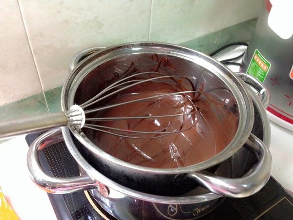 – Cho socola thái vụn vào chung với Whipping Cream vừa đun, khuấy đều cho socola tan hết và tạo thành một hỗn hợp lỏng, bóng mịn.