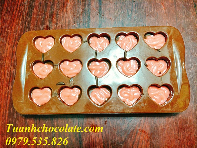 Bước 5: Cũng là bước cuối cùng. Đổ socola đen lên phần khuôn tim còn lại. Để vào ngăn mát tủ lanh (khoảng 30 phút). Socola sẽ đông cứng lại. Việc của bạn đơn giản bây giờ là lấy socola ra khỏi khuôn và xếp vào hộp trang trí thật đẹp mắt thui.