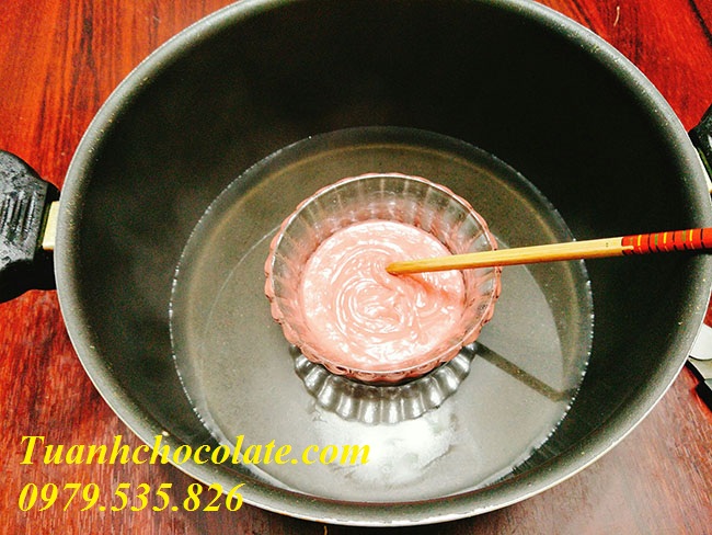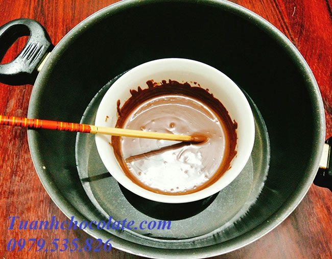 Sau đó cho socola vào bát sau đó đặt vào nồi có cho 1 chút nước để đun cách thủy chocolate , đun cho nước nóng già tầm 70-80 độ, trong khi đó bạn khuấy đều cho tới khi thấy socola tan chảy hết là tắt bếp.